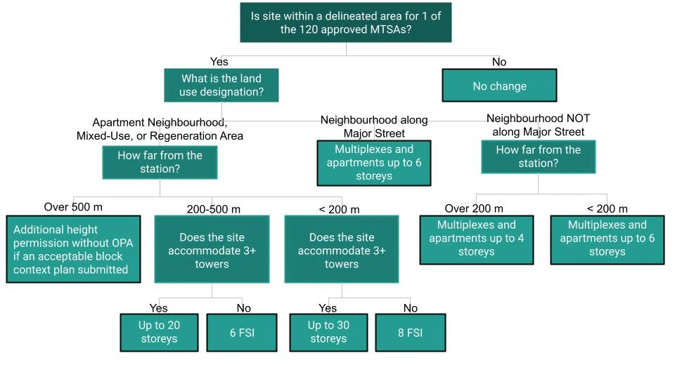 The City of Toronto approved Official Plan Amendments for 134 MTSAs and submitted them to the Ministry for approval, and is drafting another 9 for future transit stations. In August 2025, the Minister approved 120 of the MTSA plans. Importantly though, the Minister also revised the plans to include higher densities than what Toronto had originally proposed, using a set of rules based on distance and current land use.